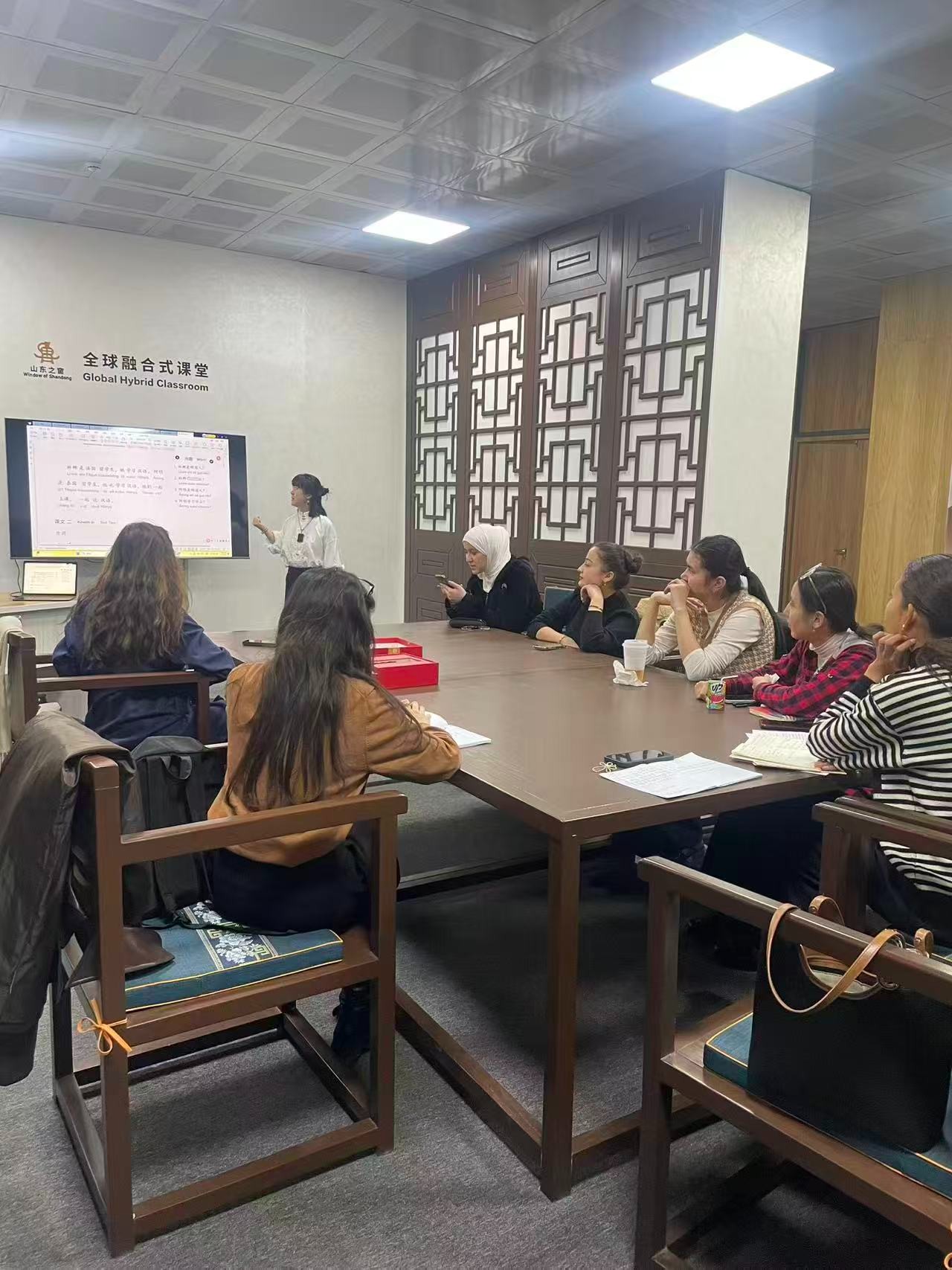 2025年9月22日,乌兹别克斯坦国际旅游与文化遗产大学“山东之窗”展览馆内,一场别开生面的中文沙龙活动火热进行。当地学生手持毛笔,在宣纸上临摹“福”字,用稚嫩却认真的汉字写下祝福;“山东之窗”讲解员穿行其间,以“拓印+故事”的创新方式讲解汉字文化,现场欢声笑语不断。这场以“语言为桥、文化为舟”的活动,成为中乌青年跨文化交流的生动缩影。