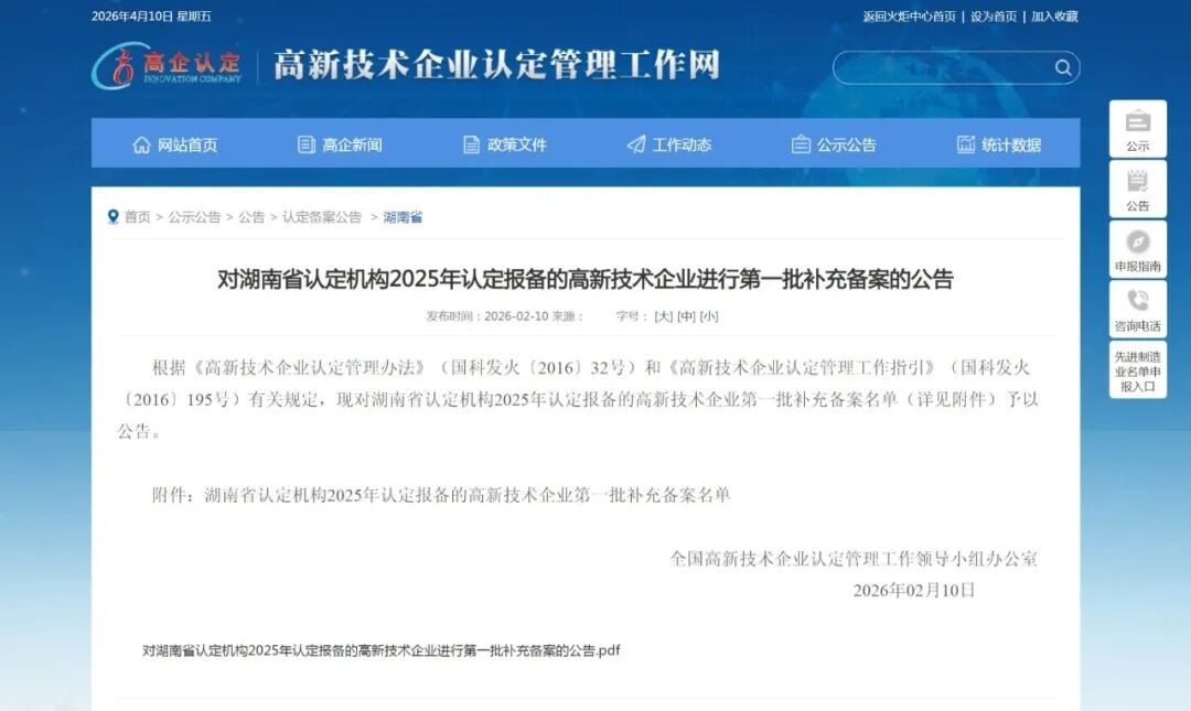 近日,全国高新技术企业认定管理工作领导小组办公室发布《关于对湖南省认定机构2025年认定报备的高新技术企业进行第一批补充备案的公告》,理想华莱旗下湖南华莱顺利通过认定,再次成功入选国家高新技术企业名单。